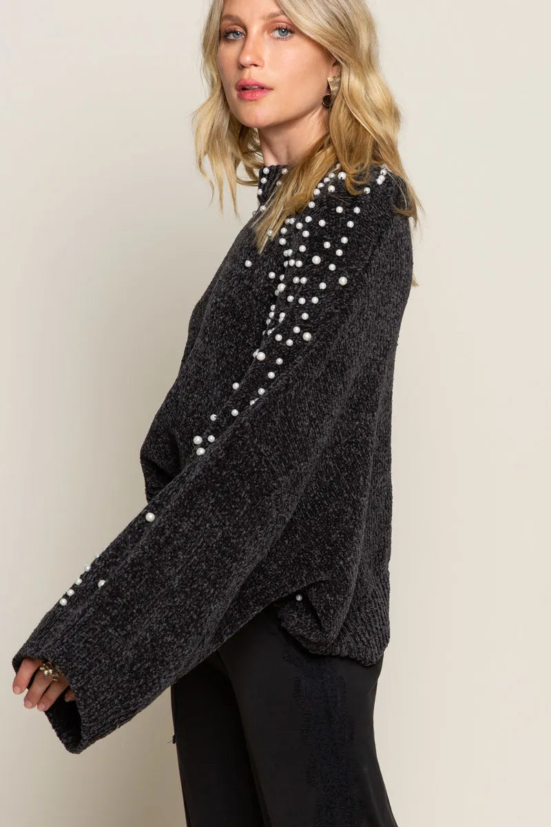 This stunning black pullover sweater features an oversized silhouette crafted from soft, comfortable knit material. The standout feature is the elegant pearl embellishments scattered across the sleeves, creating a luxurious and sophisticated look. The mock neckline adds a modern touch while the relaxed fit ensures all-day comfort. Perfect for both casual and dressy occasions, this versatile piece combines cozy warmth with glamorous style. The high-quality knit construction provides durability and maintains its shape, making it an essential addition to any fashion-conscious wardrobe.