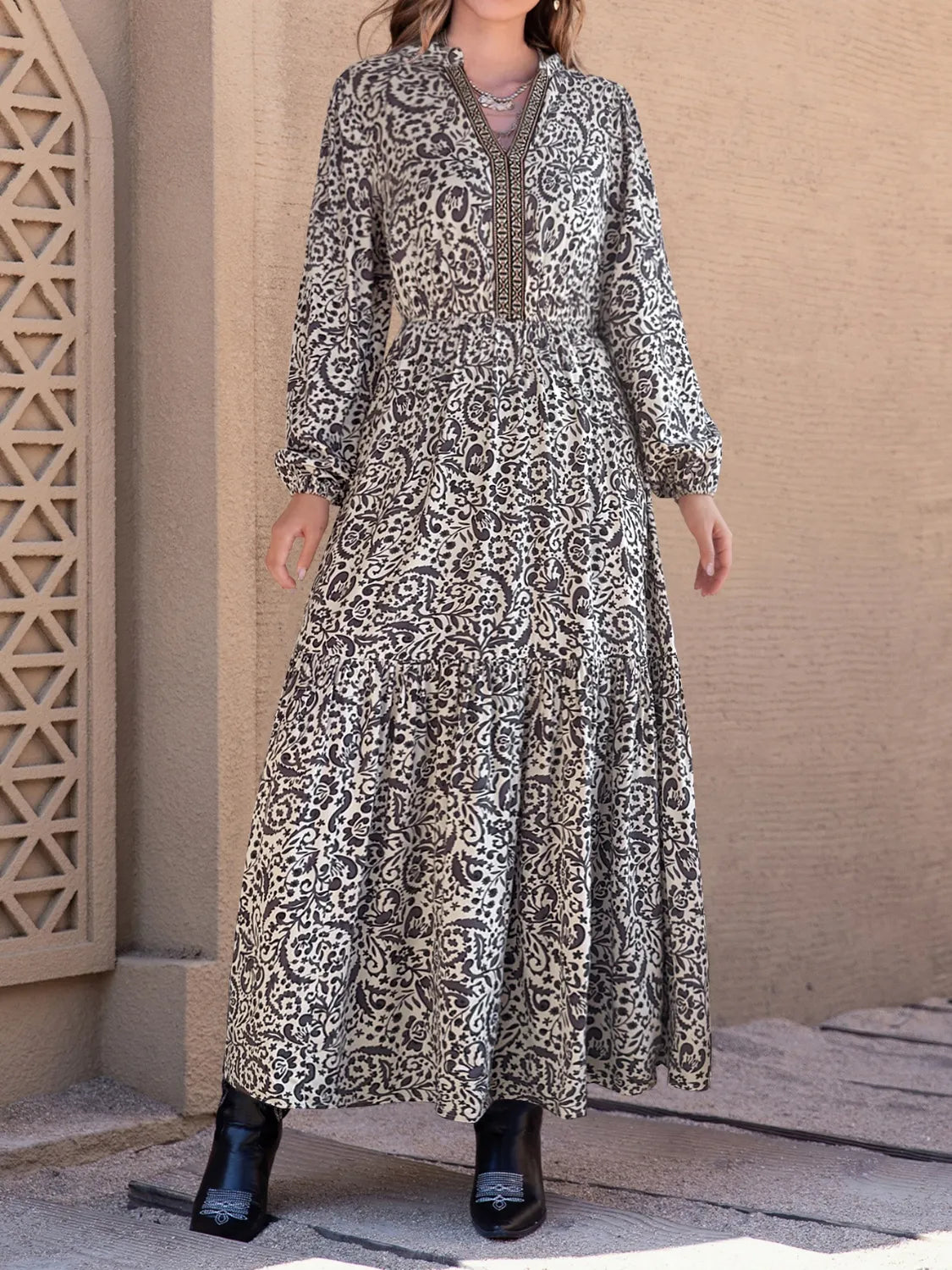 Printed Notched Long Sleeve Maxi Dress